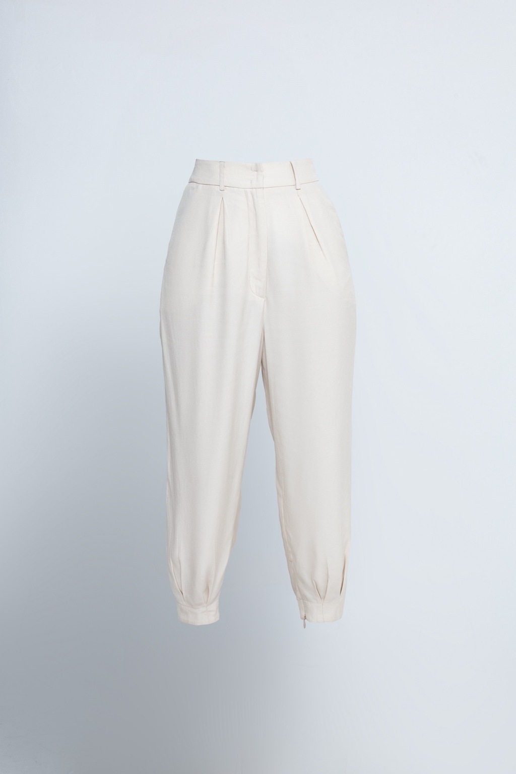 Calça cintura alta em viscose encorpada com pregas na barra e no cos, com passante e zíper invisível na barra . Bolsos facas frontais e chapado atras. Fechamento por zíper e ganchos com botão de segurança impedindo a abertura do tecido do cós.